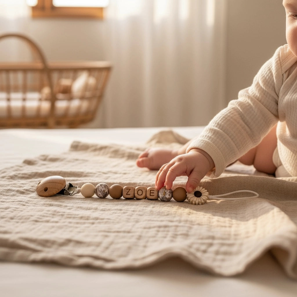 Personnalisée avec le prénom de bébé, elle garde la tétine toujours à portée de main tout en apportant une touche unique et élégante.