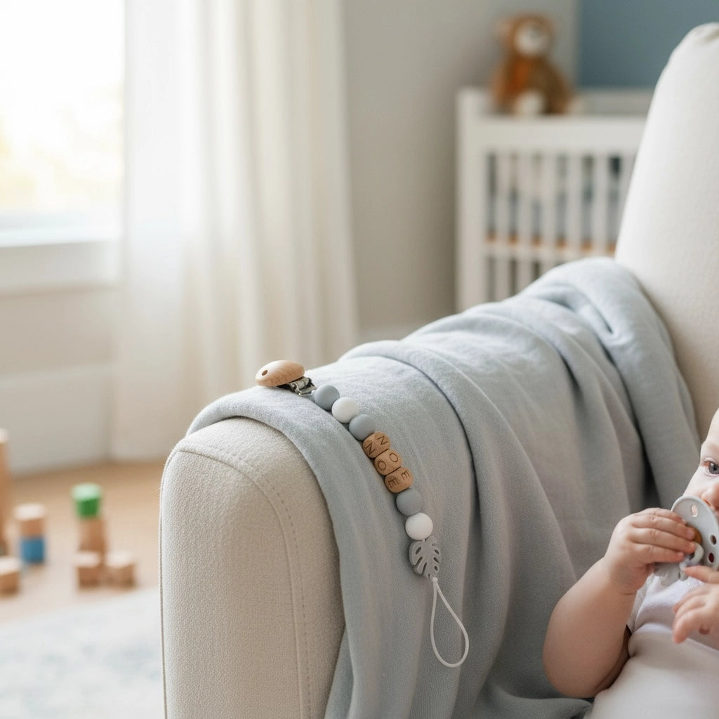 L’attache-tétine Nuage se distingue par ses nuances tendres de gris et de blanc, inspirées de la douceur des premiers instants.