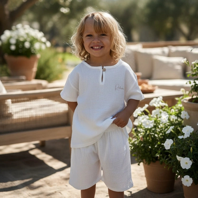 Cet ensemble en double gaze de coton dégage une sensation de légèreté, de naturel et de confort absolu.