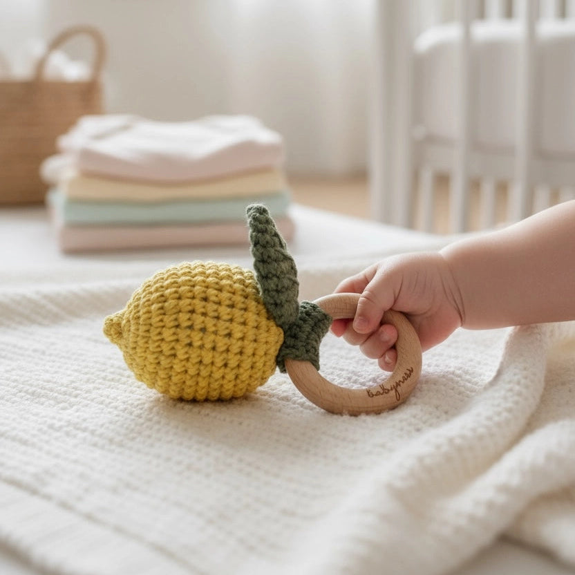 Ce hochet de dentition en bois, orné d’un citron en crochet, soulage les gencives de bébé tout en éveillant ses sens. Facile à attraper, il émet un doux bruit lorsqu’il est agité, stimulant ainsi l’éveil et la motricité.